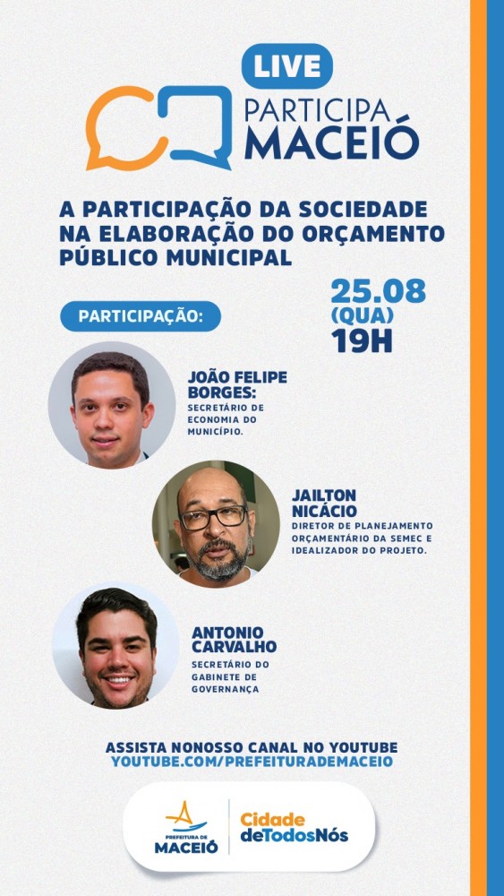 A live vai contar com a participação do secretário Municipal de Economia, João Felipe Borges; do secretário do Gabinete de Governança, Antonio Carvalho; e do idealizador do Participa Maceió e diretor de Planejamento Orçamentário da Secretaria Municipal de Economia (Semec), Jailton Nicácio.