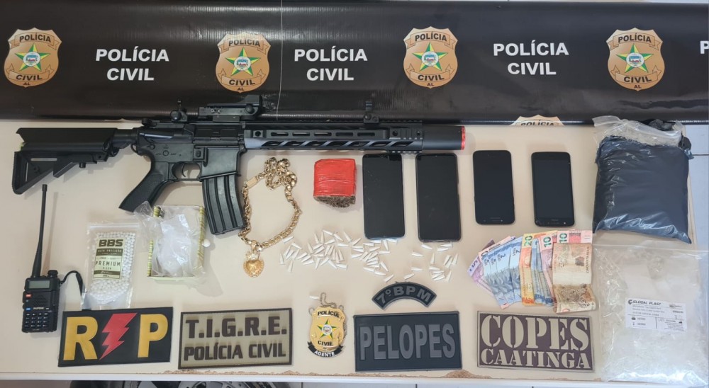 No local da busca, foram encontrados diversos objetos ilícitos, incluindo 68 pinos e quatro trouxas de cocaína, além de uma arma Airsoft no estilo fuzil.