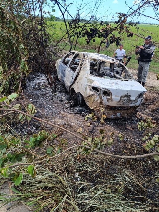 A Polícia Militar (PM) foi acionada e ao chegar no local encontrou dois corpos também totalmente carbonizados dentro do veículo, um Fiat Siena de cor branca.
