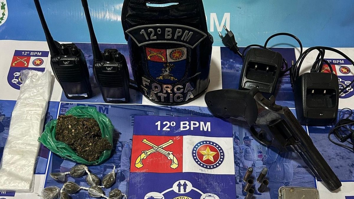 Durante a operação, os policiais apreenderam um revólver calibre 38 com duas munições intactas e três deflagradas. Também foram encontrados uma quantidade de maconha e cocaína, além de uma balança de precisão — material comumente usado na preparação de entorpecentes para venda.