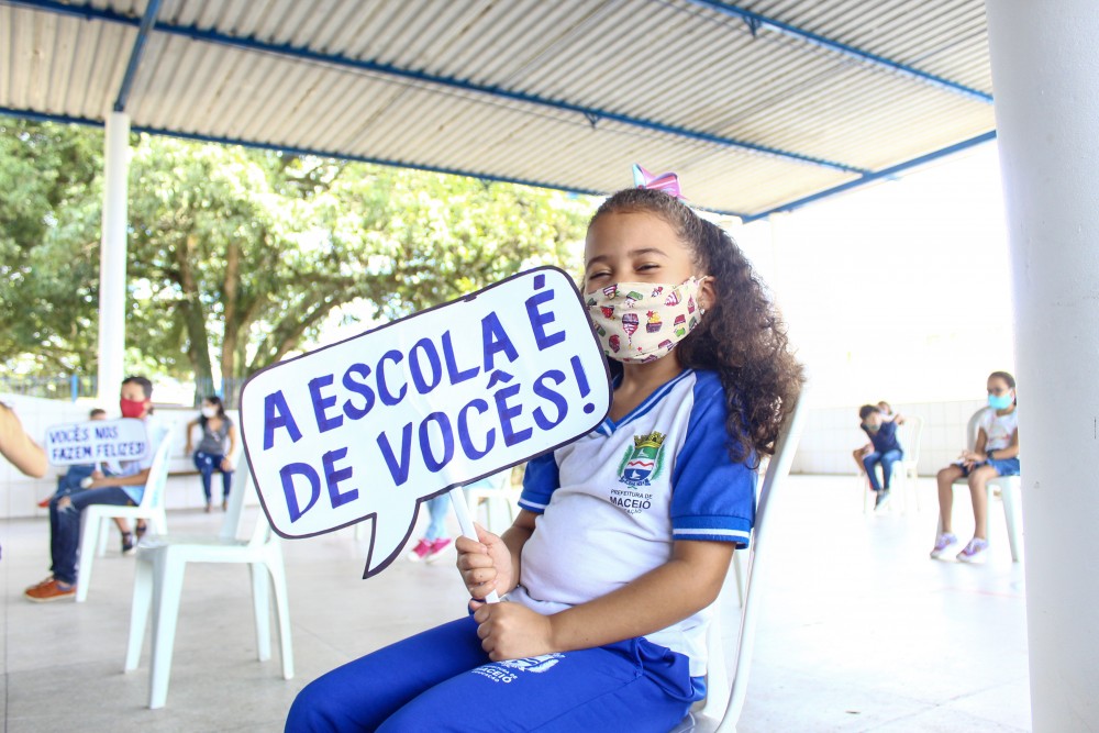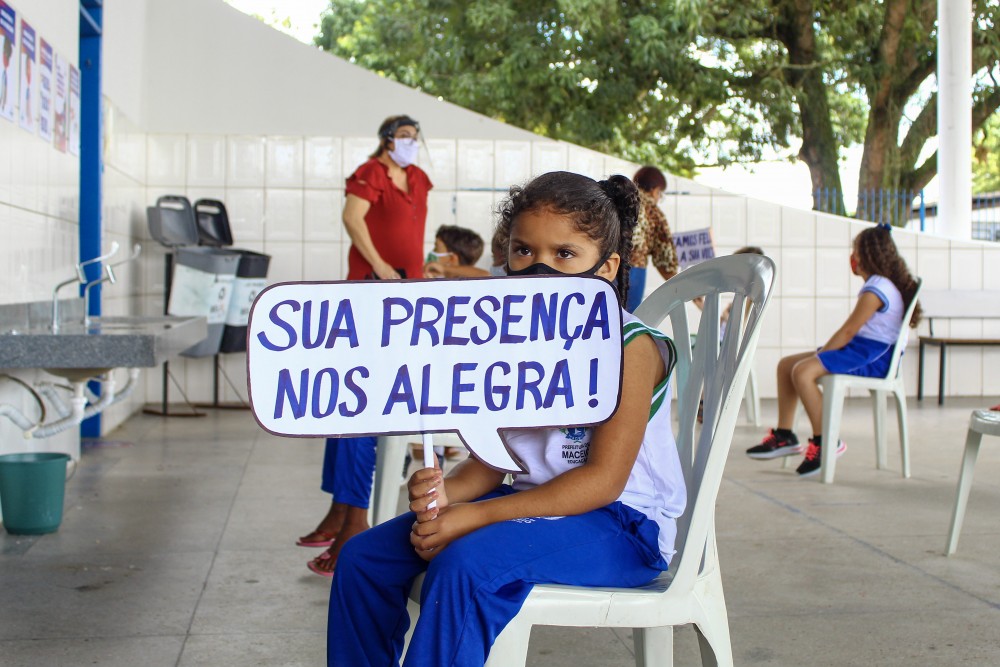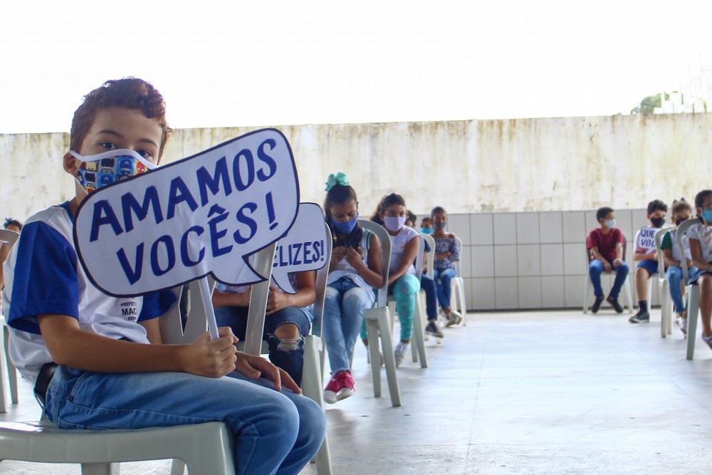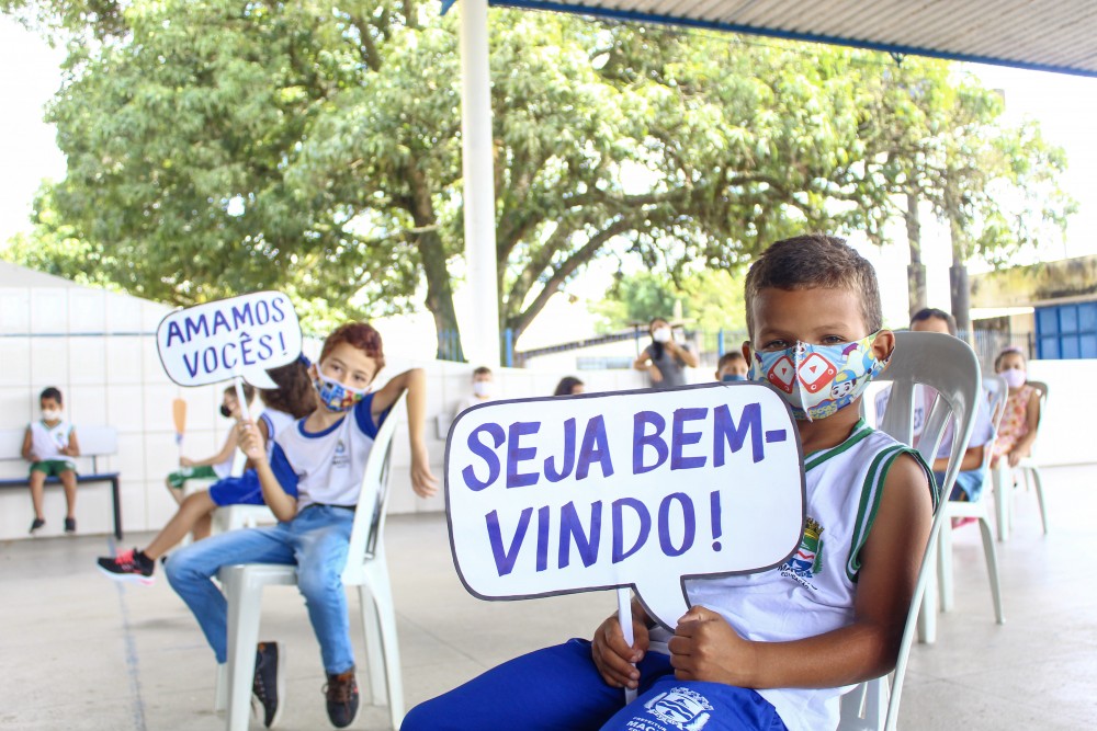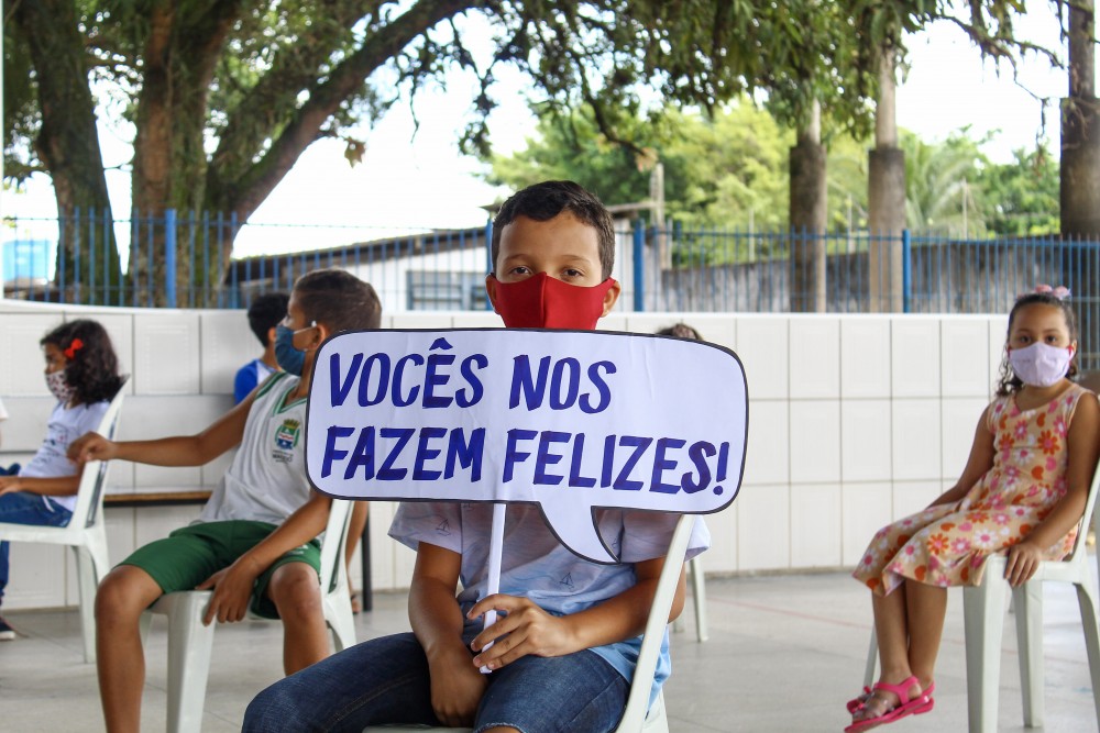 As crianças celebraram a volta às aulas na escola, com plaquinhas agradecendo o esforço empreendido pela Secretaria Municipal de Educação (Semed) e pelos funcionários da escola em prol do retorno. Gabriel Barros, estudante do 4º ano da escola, diz que sentiu falta de brincar com os amigos na escola.